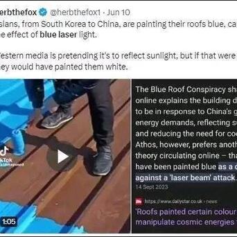 原来,我们中国人用的防水材料普遍是蓝色的,主要是为了方便施工时用肉眼判断施工质量。结果,有美国人却把它直接“阴谋论”化,说中国发现西方的激光武器已经投入使用,所以正在紧急要求民众把屋顶涂蓝,这样可以有效阻止激光武器点燃屋顶。#“中国人涂蓝屋顶”为何吓到美网民#